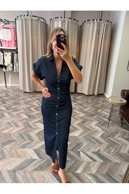 9737-258198 DENİM DÜŞÜK KOL DRAPELİ ELBİSE